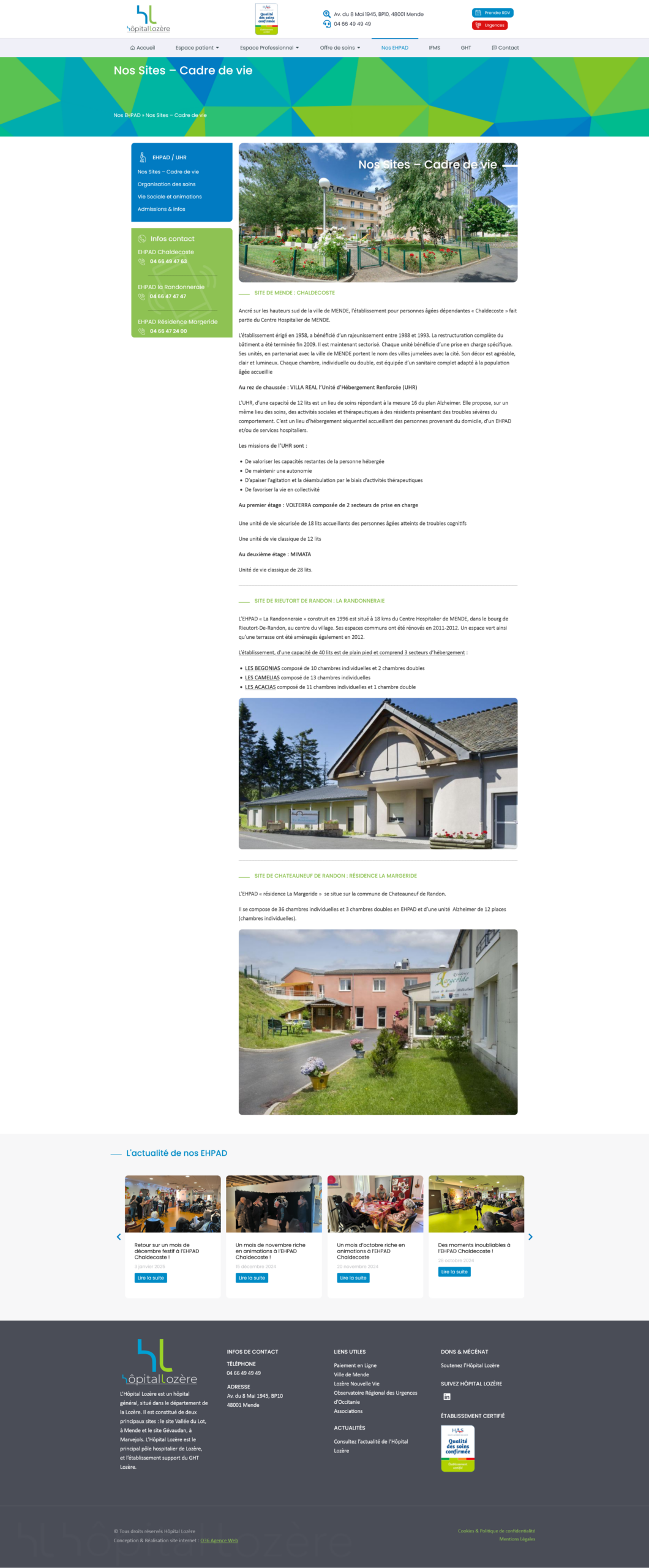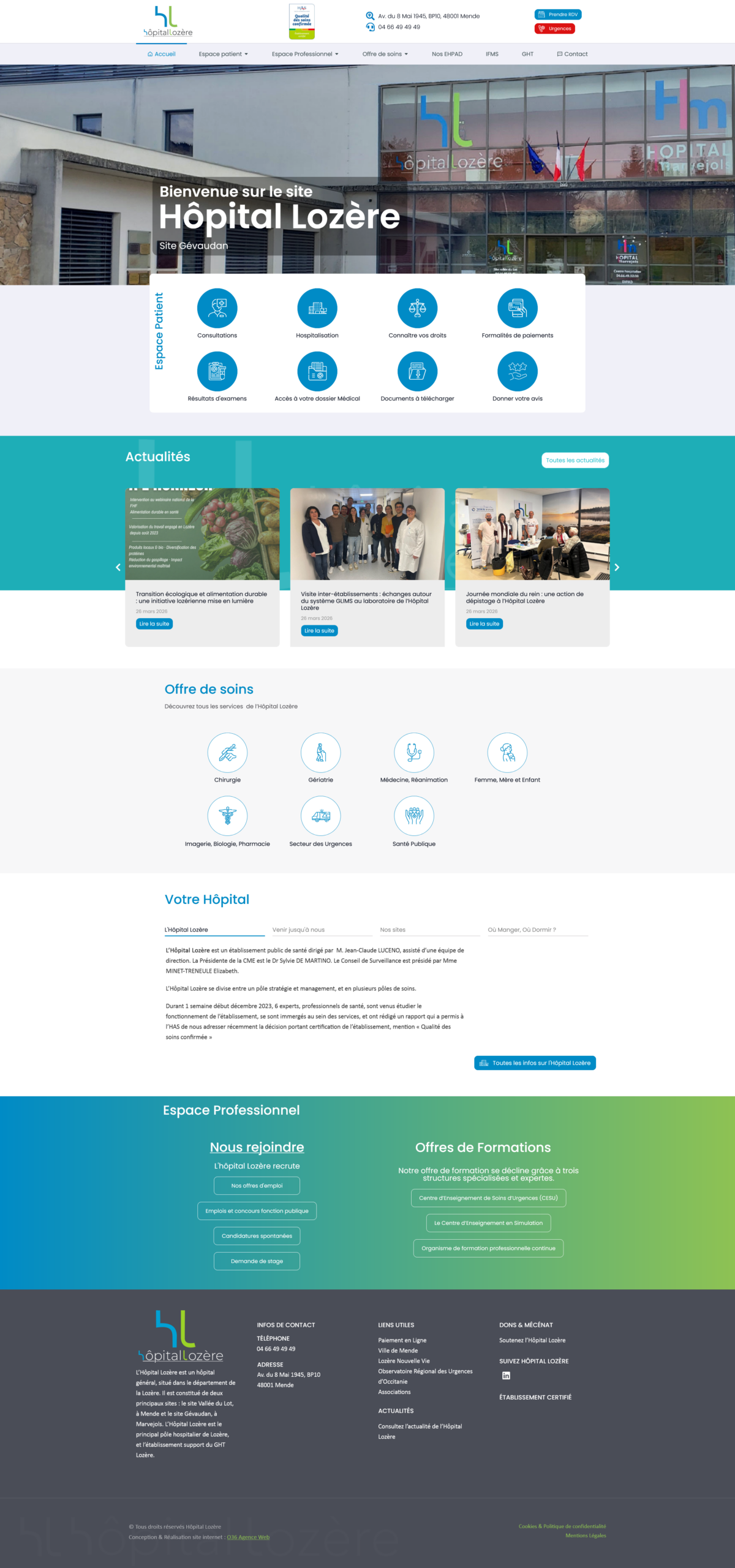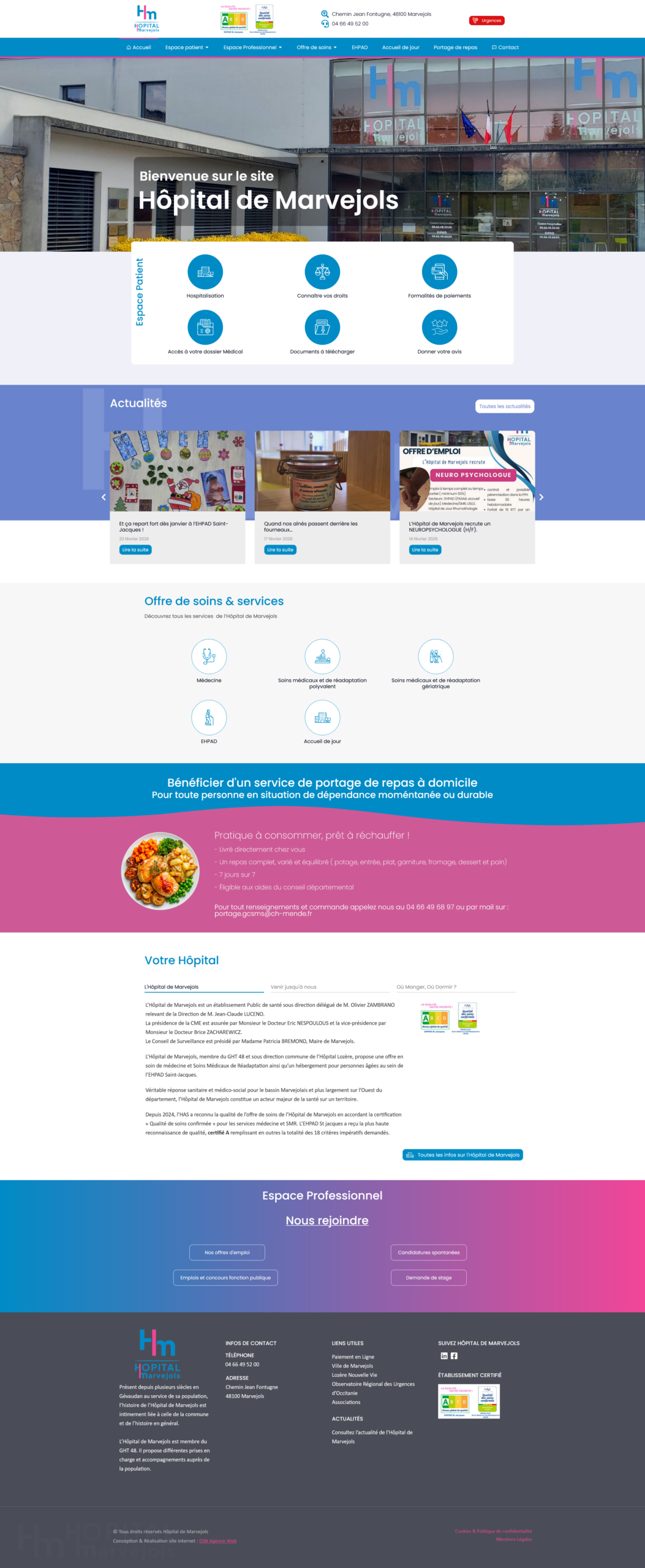 Réalisations pour l’Hôpital Lozère et l’Hôpital de Marvejols, l’enjeu ici était d’organiser et hiérarchiser le contenu, offrir une navigation intuitive pour les patients que ce soit sur PC, tablettes ou téléphones.